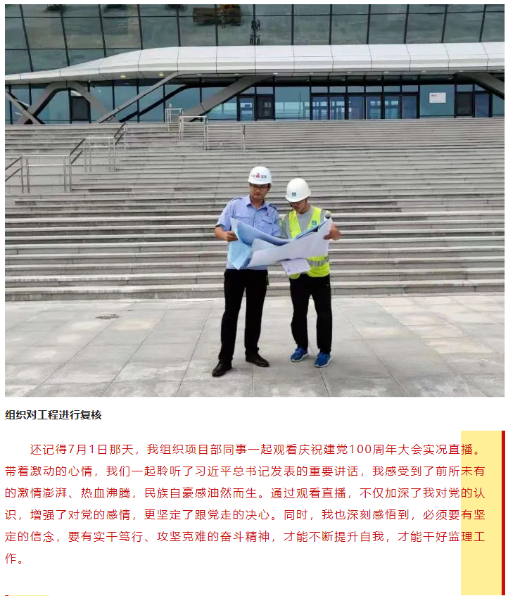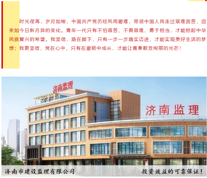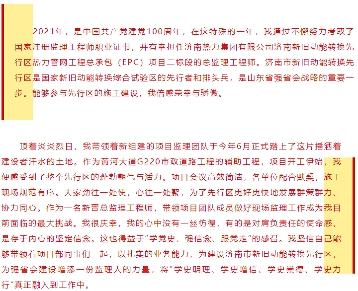 济南监理总监理工程师于理耐奋斗事迹获市直机关团工委“学百年党史 话青年担当”奋斗心声活动展播