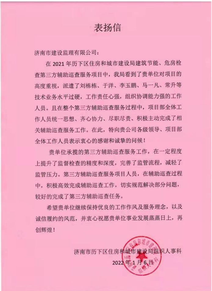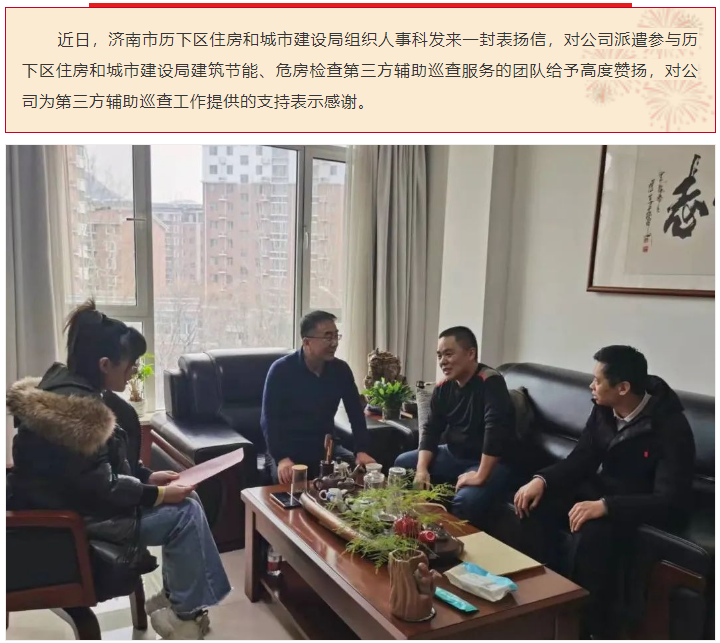 点赞!公司第三方辅助巡查服务团队获历下区住房和城市建设局组织人事科来信表扬